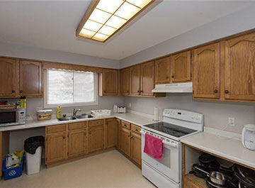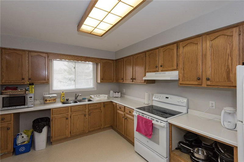 Stove, refrigerator, microwave, coffee maker, plates, cups, utensils, pots and pans.
